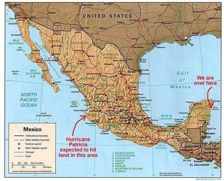 Thanks to our friends Karen and Skip of Tulum for this perspective of our distance from the storm. Mexico is three times bigger than Texas.